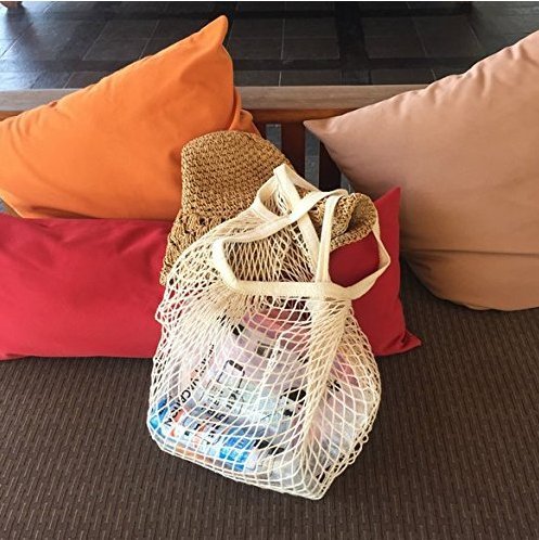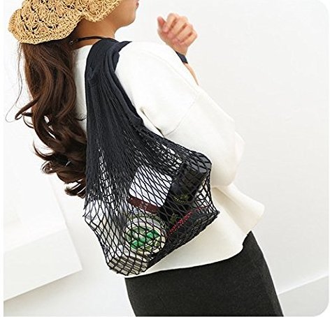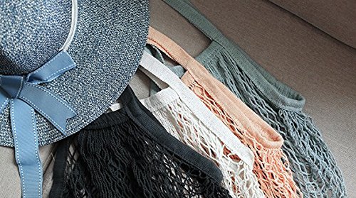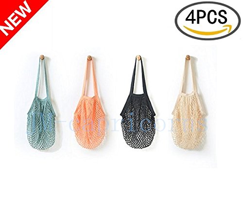 JM-capricorns 4 Pack - Portable/Reusable/Washable Cotton Mesh String Organic Organizer Shopping Handbag Long Handle Net Tote (Grey Blue/Black/Beige/Pink)