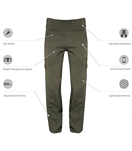 Say goodbye to the worry of leaving your essential items behind! The SCOTTeVEST Margaux Cargaux Travel Pants are our latest innovation for busy women on the go who always want to stay connected while looking great. With 11 versatile pockets and features, all engineered to securely carry all of your everyday necessities, you'll be able to bring everything you need, no matter where your travels take you! These sleek, comfortable pants are packed with pockets to keep everything you need readily accessible, allowing you to cut a flattering profile, even with fully loaded pockets. Available in black and olive, the Margaux Cargaux Travel Pants are the perfect melding of form and function, whether you dress them up or down. The pants are designed with adjustable ankle tie details and an adjustable, flexible waistband that can be worn high or low rise. With a carefully designed, chiropractor tested,Weight Management System you'll never feel weighed down no matter how many gadgets you love to carry. From your cell phone to your camera, glasses, lipstick, wallet, passport and more, the Margaux Cargaux pants will become an indispensable travel garment that complements any wardrobe. Made from a comfortable blend of cotton and polyester, you'll always feel at home in your Margaux Cargaux Travel Pants!Feature