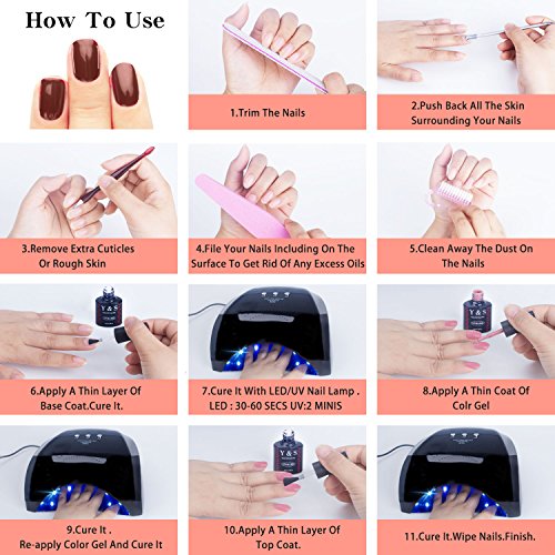 Usage: Step 1 : file the nail slightly with fine file Step 2: using cleanser to wipe the nails Step 3: brush base, and curing under UV or Led lamp Step 4: brush soak off gel polish , curing under UV or Led lamp Step 5: brush soak off gel polish again ,curing under UV or Led lamp Step 6: brush top coat, curing under UV or Led lamp , then wipe (Please use good quality base and top coat,many customers said with our brand base and top will be better and last longer)