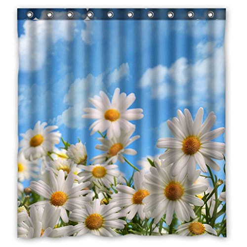 Custom Elegant Natural Wild White Daisy Flower Field Under the Blue Sky Bathroom Shower Curtain with Rings 66 x 72 Inches