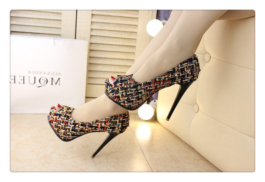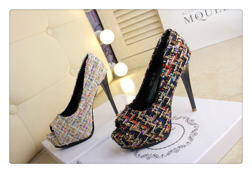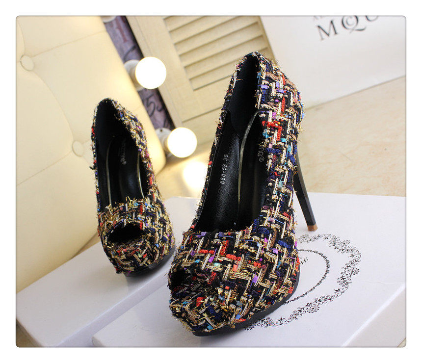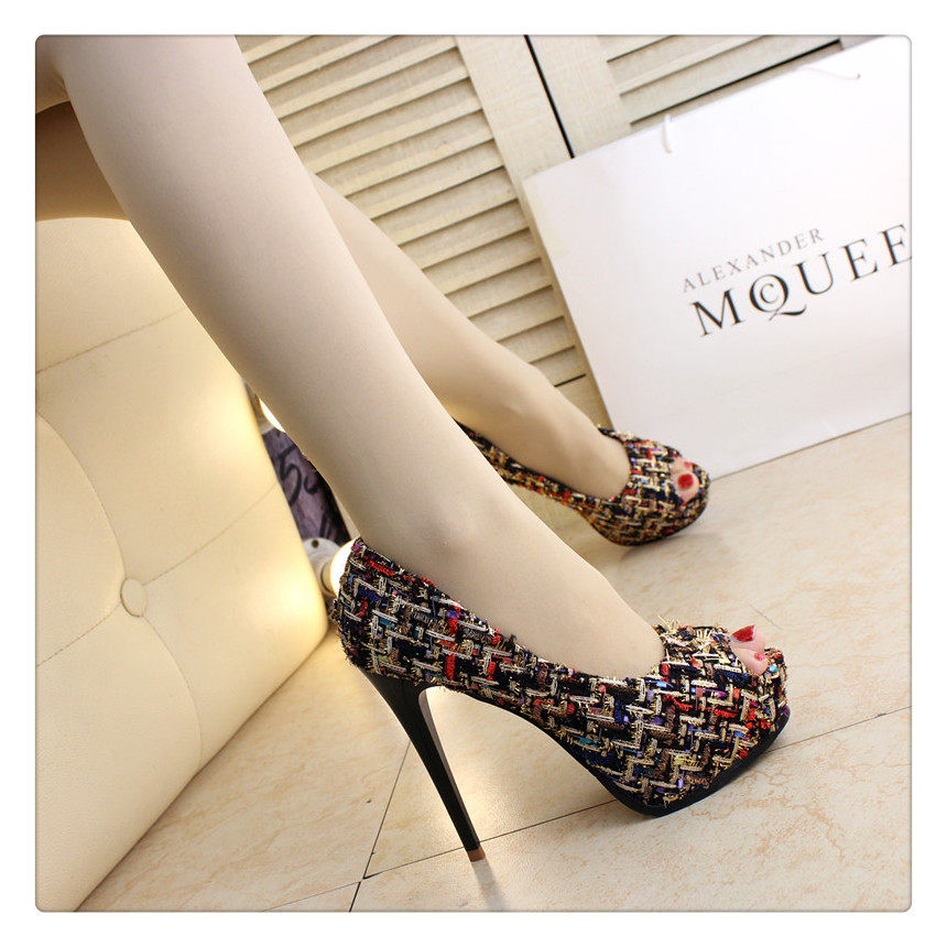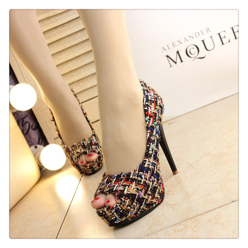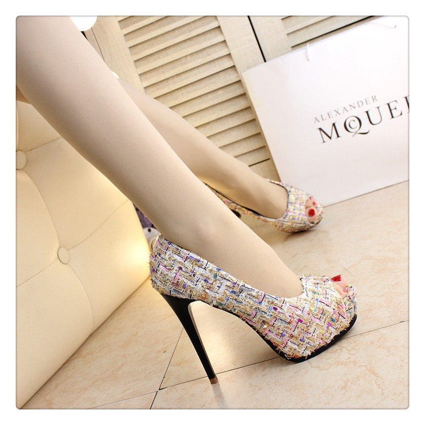 12cm秋鱼嘴鞋细跟超高跟拼色编织时尚高跟鞋防水台夜店百搭女
