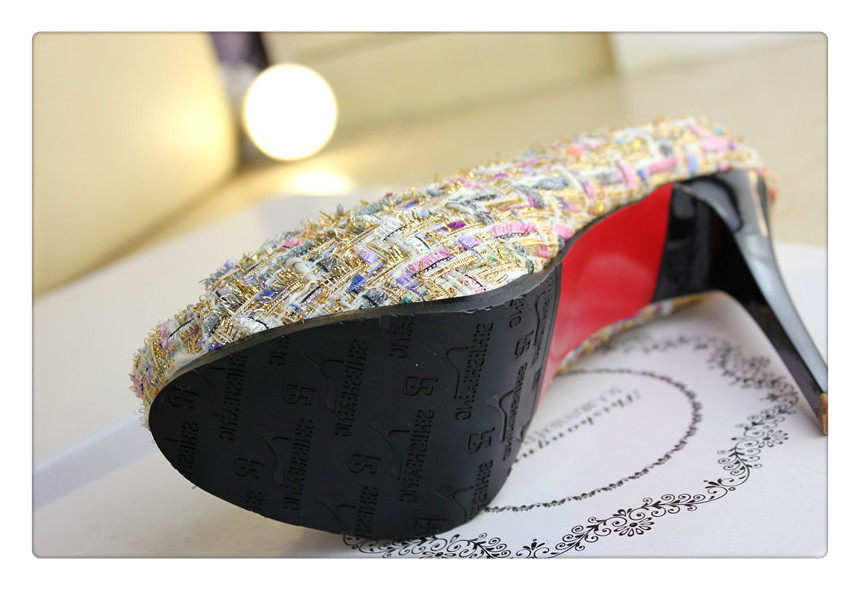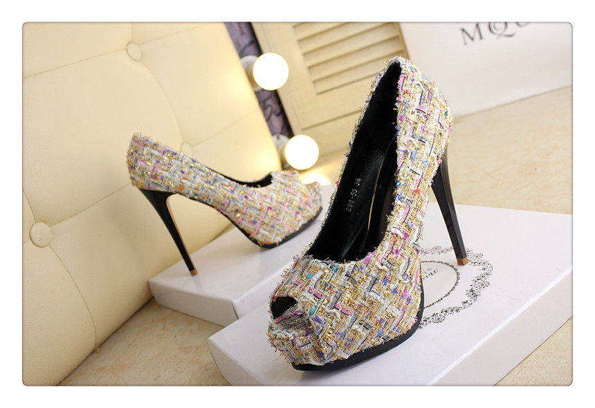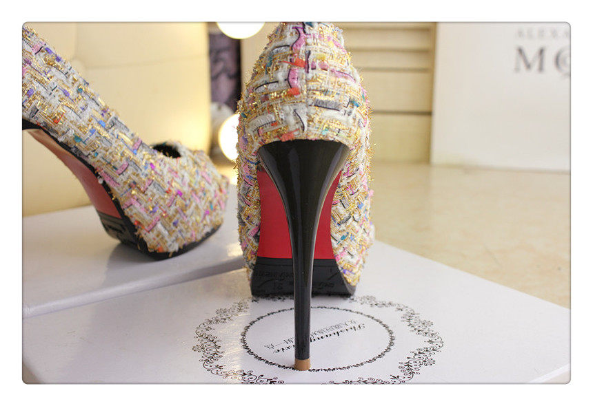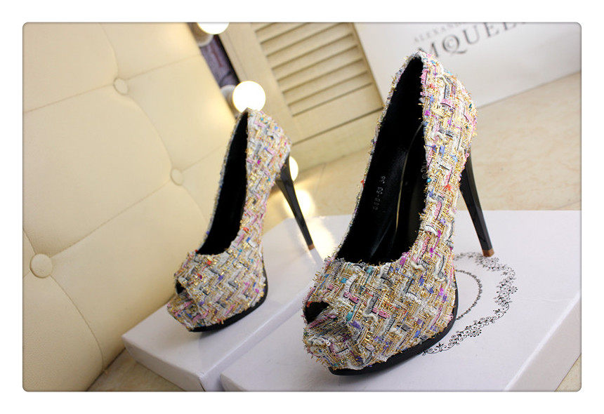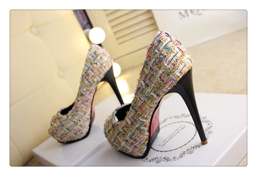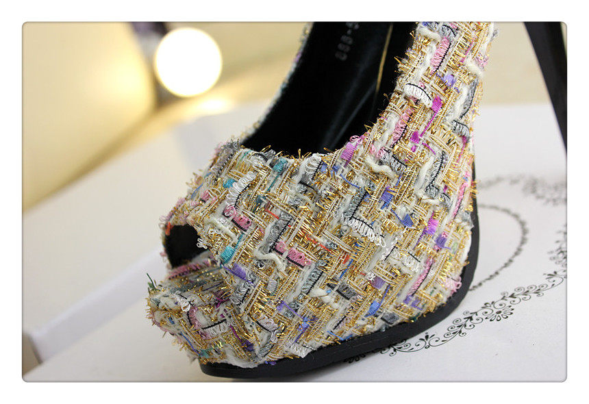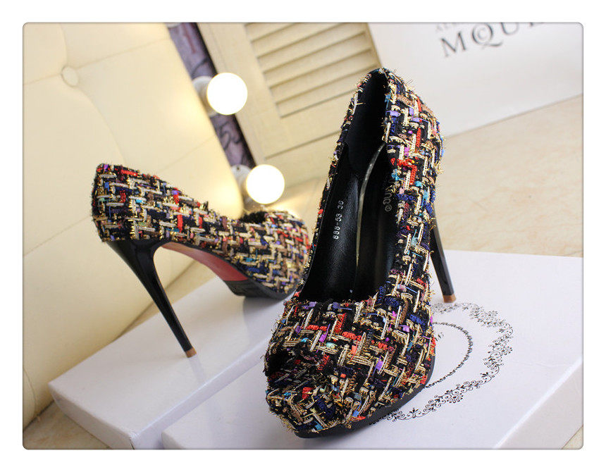 12cm秋鱼嘴鞋细跟超高跟拼色编织时尚高跟鞋防水台夜店百搭女