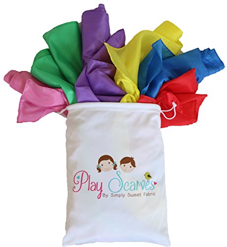Large in size, 35 x 35 inches, almost a full yard of fabric! Large enough to wrap around a child. Inspired by Waldorf Toys, play silks allow the children to use their imaginations. Use them for capes, dress up, doll blankets, tight ropes, costumes and accessories, and more! Bundle comes with 6 bright colors; red, blue, yellow, green, purple, and pink. Loved by both boys and girls. Not another noisy toy that you will step on in the night and hurt your foot :) Your children will love to dance, move, and dress up with these scarves.