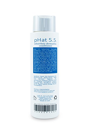 -. Binding : Misc. -. Brand : pHat 5.5 -. Feature : SEBORRHEIC DERMATITIS DEEP CONDITIONING FOR HAIR, SCALP, AND SKIN - delivers vital nutrients / NATURAL ORGANIC INGREDIENTS - Safe for sensitive skin and promotes soft healthy skin / STOP FLAKES NOW! Don't use your sulfate shampoo or conditioner. SLS and SLES can cause scalp conditions / FEELS GREAT ON YOUR HAIR, SKIN, AND SCALP - starts working immediately / DRAMATIC IMPROVEMENT IN A WEEK - But the results are better and better and the weeks and months pass -. IsAdultProduct : 0 -. Label : pHat5.5 -. Manufacturer : pHat5.5 -. NumberOfItems : 1 -. ProductGroup : Beauty -. ProductTypeName : BEAUTY -. Publisher : pHat5.5 -. Studio : pHat5.5 -. Title : Seborrheic Dermatitis Therapy Conditioner by pHat 5.5