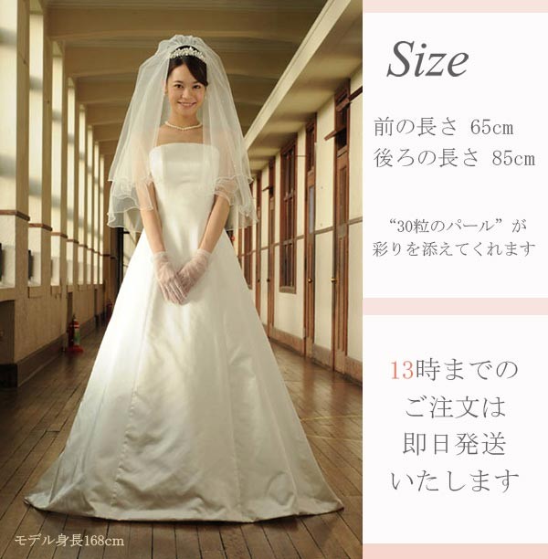 どのタイプのウェディングドレスにもあわせていただきやすいデザイン。 後ろの長さは、落ち着きある85cmです。