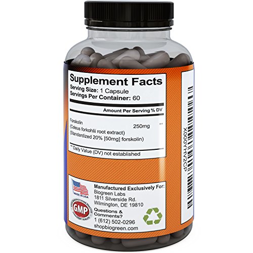 Burn belly fat and lose weight with pure and natural and potent Forskolin for weight loss by Biogreen labs. These Forskolin capsules are proven weight loss supplements for men and women that can help increase testosterone production and act as an appetite suppressant to help the user achieve their diet, exercise or fitness training goals. Each pill contains 250 mg Forskolin, or Coleus Forskohlii, and has a 20% standardized pure Forskolin extract - as well as being manufactured in the United States of America in a GMP certified facility. Each bottle contains 60 servings, and the capsules are vegetarian friendly as well!This supplement can also help to lower blood pressure, as well as boosting the immune system and helping the body to fight off illness and the symptoms of ill health. It's a natural substance found in subtropical areas of Africa and India. These weight loss pills can also help a user to gain muscle through the boosted levels of testosterone, as well as helping them to burn fat as Forskolin can also act as an appetite suppressant.Feature
