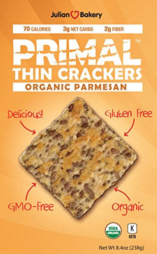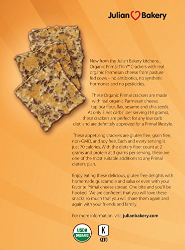 -. Feature : Delicious Crunchy Organic, Low Carb, Gluten Free, Grain Free, P.R.Imal Cracker / Seedy delicious flavor that puts a Cheesy Crunch Back Into Your Food Plan / Made With USDA Organic Ingredients, GMO FREE, Simple Delicious Ingredients. / 6 Crackers = 70 Cal, 3 Net Carbs, 3g Protein, 2g Fiber (Keto) / Made with Organic Grass-fed Parmesan Cheese (Adults & Kids Love!)