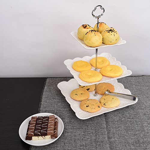 -. Title : 3 Tier Square Porcelain Cake Stand with Sugar Tongs - Party Food Server Display Set - Three Tier Dessert Stand - Perfect for your Tea Party, Baby Shower and Dessert Table - (White)