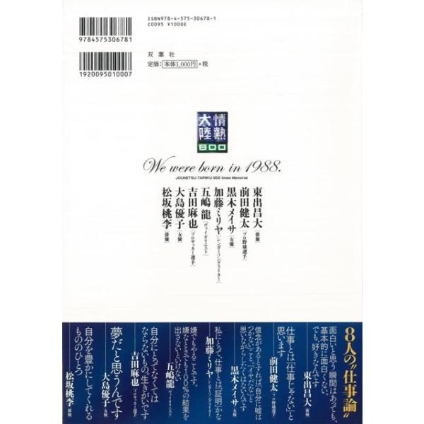 【商品説明】 定価(税込み):1,080円 値引き:2% OFF MBS『情熱大陸』800回記念特別企画「ぼくらは、1988年生まれ」。スポーツ界をはじめとして、第一線で活躍する人材を多く輩出しているといわれる「1988年生まれ」の若者たちに注目したインタビュードキュメンタリーが、1冊の本になりました。放送されなかった未公開部分のインタビュー、番組撮影時に垣間見せた彼らの素顔を捉えた写真も収録。 バーゲンブック 新品 特価 格安 エンターテインメント タレント ミュージシャン TV スポーツ 写真 ドキュメンタリー | |