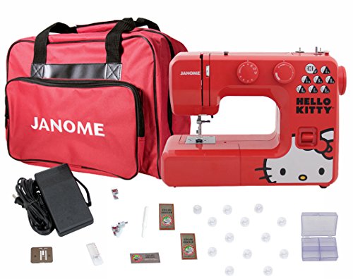 -. Feature : The Janome Hello Kitty 13512 sewing machine is not only cute, but it's durable too! The interior metal frame keeps the machine still to avoid skipped stitches. Customizable features like the 12 stitches, 4-step buttonhole, adjustable stitch length and zigzag width give you the freedom to create your unique designs. Advanced features like to free arm for small projects and ensure that this is a sewing machine you can grow into. Four presser feet are included! / Bonuspack Includes: Two Packs of Organ Needles, 10 Plastic Bobbins, Bobbin Storage Case and Janome Sewing Machine Tote Bag in Red with Janome Logo / Features:. Front loading oscillating hook bobbin Metal Frame 12 Built-in stitches 1 Four-step buttonhole Manual thread tension control Snap on presser foot 3-Piece feed dog Free Arm Easy Reverse lever Push/Pull Bobbin Winding Extra High Presser Foot Lift Stitch Selection dials Built in sewing light Maximum stitch width: 5mm Maximum stitch length: 4mm