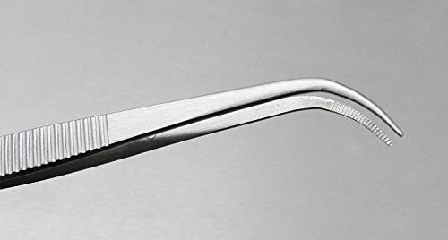 Tweezers with rounded curved tips, fine tips that provide a good grip.