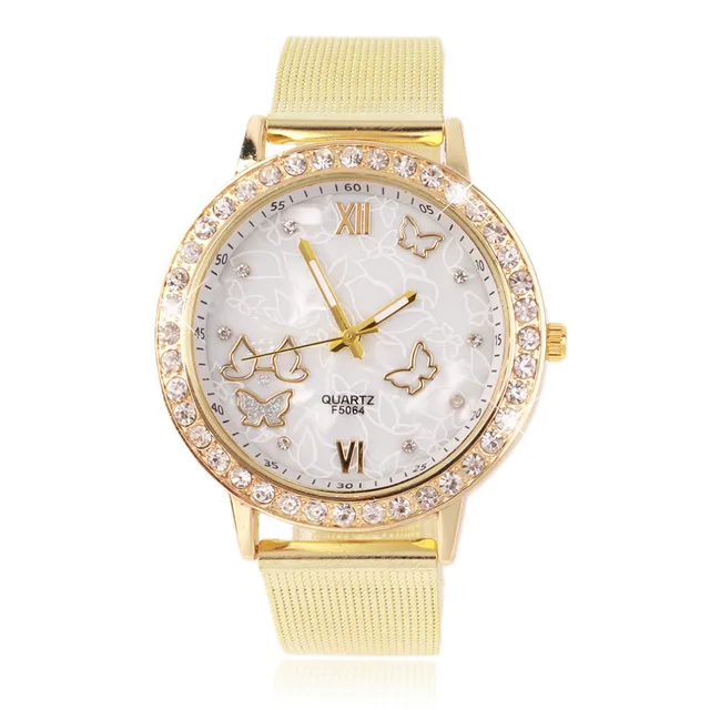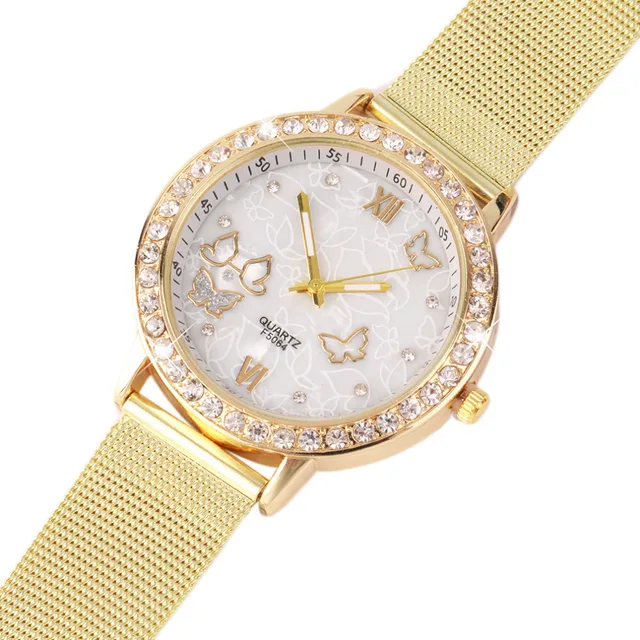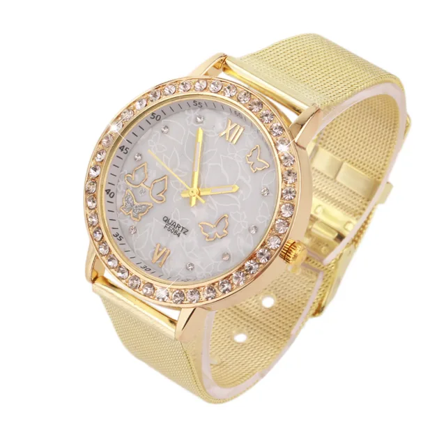 여성 패션 골드 크리스탈 나비 금속 메쉬 밴드 석영 아날로그 손목 시계 relogio feminino 핫!