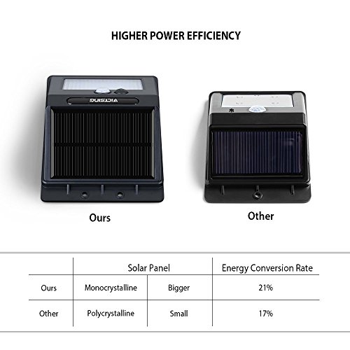 - Upgraded Solar Powered Outdoor Lights. With improved monocrystalline silicon solar panel, this outside solar light provides higher conversion rate up to 21%, which can help shorten the charging time (The conversion rate of polycrystalline silicon solar panel is only 17%). Furthermore, this security light adopts diamond lampshade, which ensure the lights can be distributed evenly without reducing brightness.