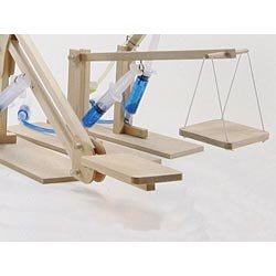 The arm moves with the force of water put in the injector, and the principle of hydraulic construction machine is reproduced with water.