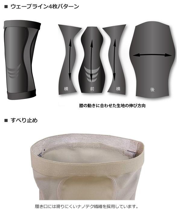 「ズレにくく膝蓋骨周りに常時一定の圧迫感がある」というところに焦点を合わせ、様々な角度から膝の働きを分析して作られたサポーターです。膝を両側から挟み込み、動きに合わせて生地が伸びる構造になっています。 |