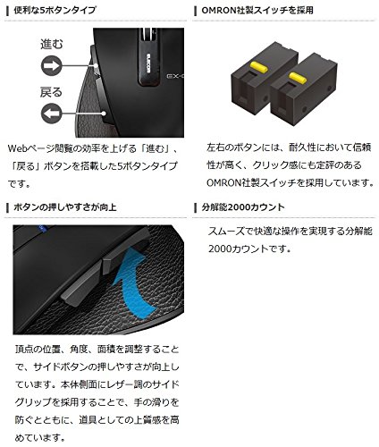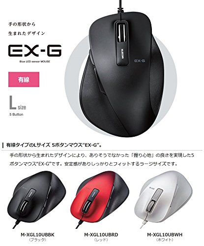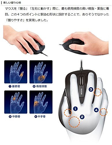 In design it was born from the shape of the hand realizing the goodness of further "grip comfort". Equipped with BlueLED that can be operated comfortably anywhere 5-button mouse that was realized by a wired type of 5-button mouse "EX-G" ◆ design was born from the shape of the hand a "grip ease" a were not likely It is "EX-G". ◆ it is a large size to tightly fit there is a sense of stability. ◆ focusing on the most frequently used thumb and ring finger during the mouse operation proximal phalanx thenar eminence middle phalanx it has been designed in the form that adapt to the four points of the metacarpal bone. ◆ By adopting the side grip of tone leather side of the body prevents the slip of the hand we have extended sense of quality as a tool. ◆ small light is reflected more accurately even in uneven and dust is equipped with a BlueLED that can be comfortably used in any place. ◆ It is resolution 2000 count to achieve a smooth and comfortable operation. ◆ increase the efficiency of the Web page browsing "Forward" it is a 5-button type equipped with a "back" button. ◆ position of the vertex angle by adjusting the area push-friendliness of the side button has been improved. ◆ The left and right buttons high reliability in durability even to click feeling has adopted the OMRON Corp. switch proven. ◆ can be downloaded for free by utilizing the "Elecom mouse Assistant" you can assign a function of your choice to each button. /