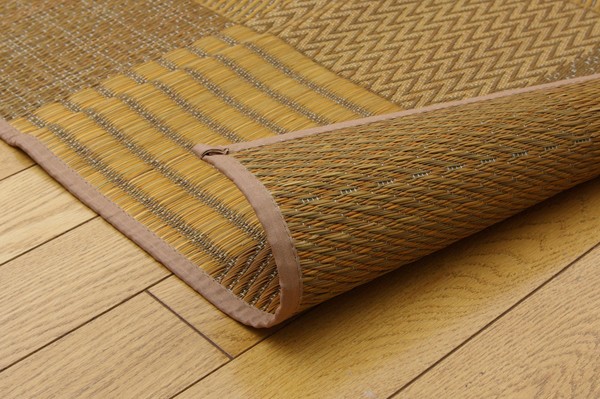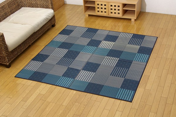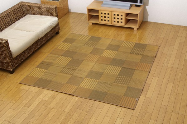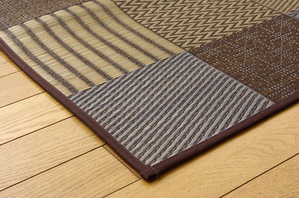 いろいろな織りを組み合わせたパッチワーク風のい草カーペットです。織り方によって違う複数の肌感触をお楽しみ頂けます。落ち着いた色目でモダンな雰囲気に仕上げました。国産(九州産)のい草を使用しています。一本一本が太く、表皮が厚く繊維がキメ細かいので弾力性があり、耐久性に優れています。い草には空気の自然浄化作用、湿度の調節作用などがあります。また汚れにくく、使用するうちに黄金色に変化し味が出ます。い草に青森ヒバ加工を施しています。(抗菌、防臭効果)