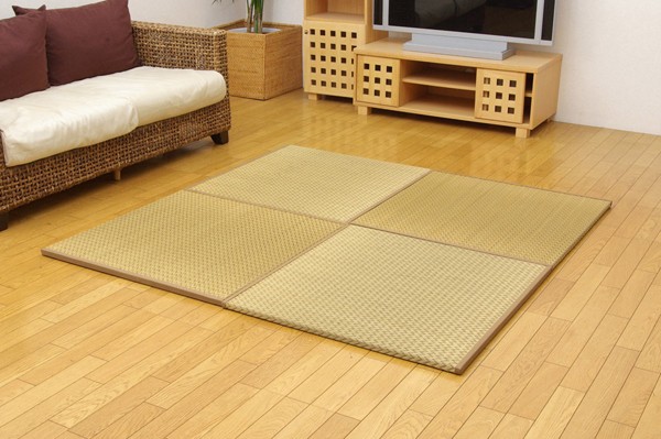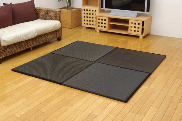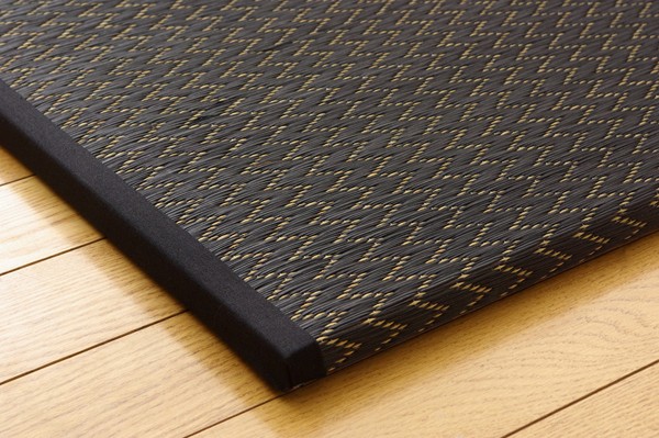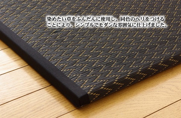 届いたユニット畳を床に置くだけで和のスペースが出来上がります。染めたイ草をふんだんに使用し、同色の色のヘリを付けることでモダンな雰囲気に仕上げました。ベージュ色とブラック色の2色を市松柄に並べても、また違ったイメージをお楽しみ頂けます。国産(九州産)のい草を使用しています。一本一本が太く、表皮が厚く、繊維がキメ細かいので弾力性があり、耐久性に優れています。い草には空気の自然浄化作用、湿度の調節作用などがあります。また汚れにくく、使用するうちに黄金色に変化し、味が出ます。中材に木製ボードを使用した重量感のある本格タイプです。裏の不織布にはすべり止め加工を施しています。また木製ボードとイ草生地の間にフェルト10mmを使用していますので、硬すぎず、やわらかすぎない適度なクッション性があります。