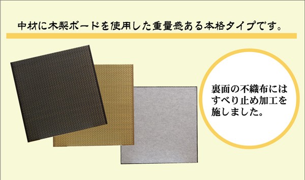 表地=い草(九州産) ※普通織 中材=フェルト10mm+木製ボード 裏地=すべり止め不織布 ヘリ=綿85%、麻15%