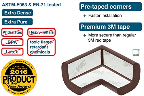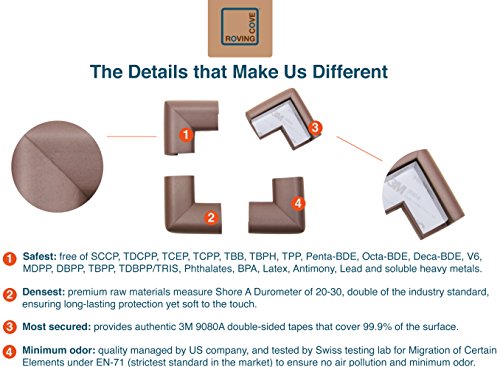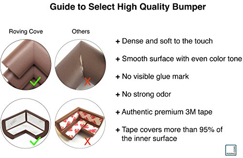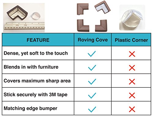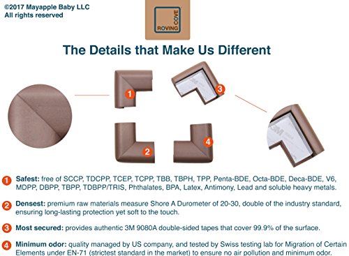 Studio : Mayapple Baby Publisher : Mayapple Baby Binding : Baby Product Product Description Roving Cove®: Measure, Cut, Apply, Stick!TM Protect your loved ones from dangerous, sharp edges and corners. Our high-density, L-shape cushions are durable, yet soft to the touch, and are able to absorb impact to help prevent injury. ASTM F963 compliant. Brand Integrity: Roving Cove®, the top-rated and best-selling brand in safety bumpers, is owned by Mayapple Baby. We guarantee your complete satisfaction. Contact us if you have any issues and we will immediately do our best to resolve them. If we can't, we will fully refund your purchase. Roving Cove® is the purest cushion available. Other brands claim to be "eco friendly" and "non-toxic" yet they add toxic flame-retardant chemicals. Roving Cove® does not add toxic flame-retardants (SCCPs). No BPA, no phthalates, no heavy metals, no SCCPs. Inherently flame-resistant; passed flammability tests under US regulations. Roving Cove® is the densest cushion available: Shore A Durometer 20-30 NBR, versus the standard 12-15. Density is more important than thicknessTM when it comes to softening impact. Roving Cove® is the first brand to offer premium childproofing products. Roving Cove® includes authentic, industrial-strength 3M double-sided tape that is wider and longer. Refer to the Instructions and diagram at left for proper tape placement. Contact us for additional tape. Pack Includes: A. 8 corner cushions with PRE-APPLIED 3M tape B. Instruction pamphlet CAUTION: Do not use on objects with weak or easily removable finish. WARNING: This is not a toy or teether. For use by adults only. ⓒ2012-2016 Mayapple Baby 0