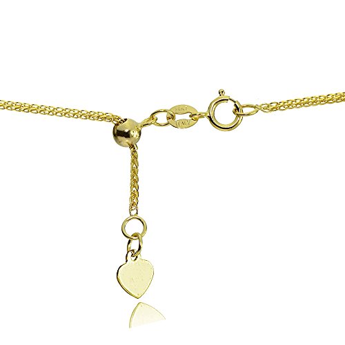 This Italian anklet features a spiga wheat design in 14k yellow gold, .8mm wide. It showcases an adjustable clasp with a dangling heart for design and fit. It opens with a spring ring clasp. The bracelet extends up to 11-inches.