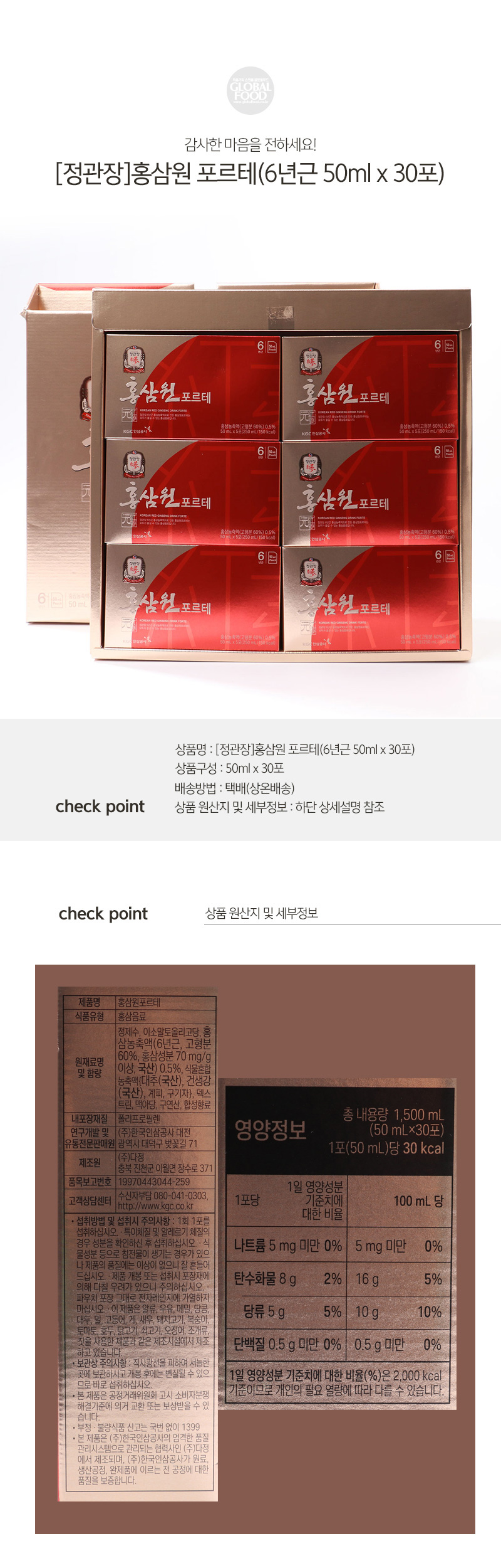 容量:50ml x 30包重要成分 :6年根紅参濃縮液0.5%召し上がり方 :1日1砲をお召し上がりください。摂取時の注意事項 :植物成分などで沈殿物が生じる場合がありますが、製品の品質には異常がないのでよく振って召し上がってください。特異体質やアレルギー体質の場合は成分を確認した後、お召し上がりください。