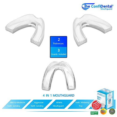 -. Feature : Unrivaled Design - The ConfiDental Dental Guards features a unique design that includes a Frenulum notch to prevent irritation and a durable bottom layer to prevent wear. / Comfortable to Use - Made of a moldable material, the ConfiDental Dental Guards custom fits to accommodate any mouth size. Includes easy to follow instructions with a step by step video on how to use the product. / Regular and Heavy-Duty Protection - Includes a total of three Dental Guards that offer Regular and Heavy-Duty Protection. One pieces feature 3mm thickness for everyday protection. Two pieces are 6mm thick for heavy-duty protection. / Easy to Clean and Reusable - Made with BPA free and Phthalates free premium grade material, The ConfiDental Dental Guards are easy to clean and can be reused. The package comes with free six cleansing tablets from Purifident for extra freshness and cleanliness. / 4 in 1 Multi-Purpose Use - The ConfiDental Dental Guards is ideal for mild to moderate teeth grinding, as well as aggressive teeth grinding. It is also perfect for use as an athletic dental guard and teeth whitening tray. 100% Satisfaction Guarantee. If you are not completely satisfied with your purchase, simply let us know!