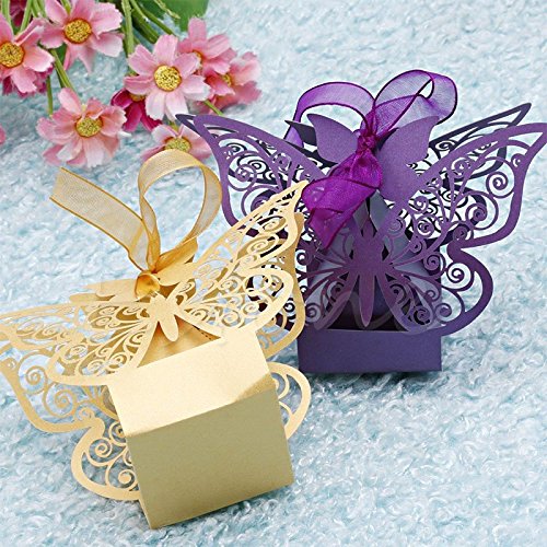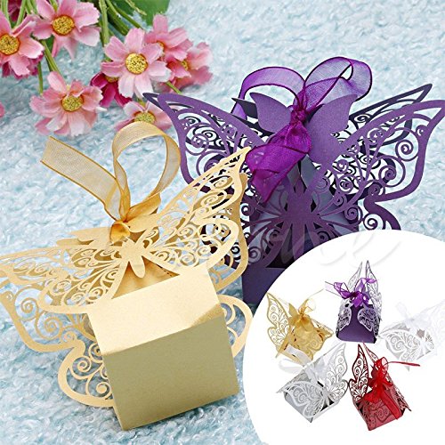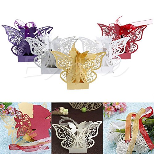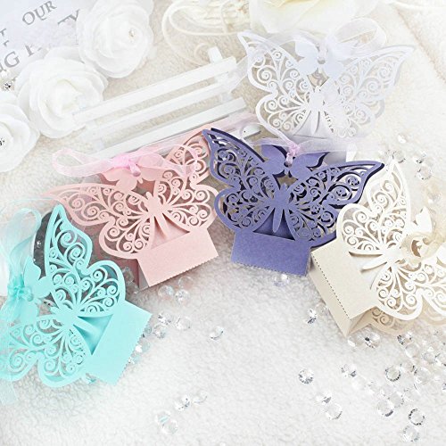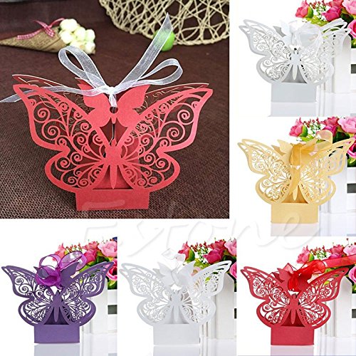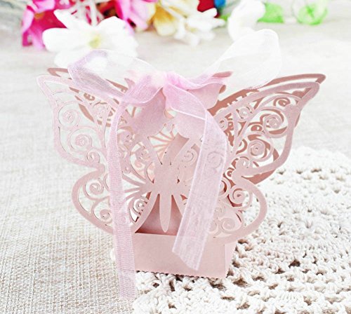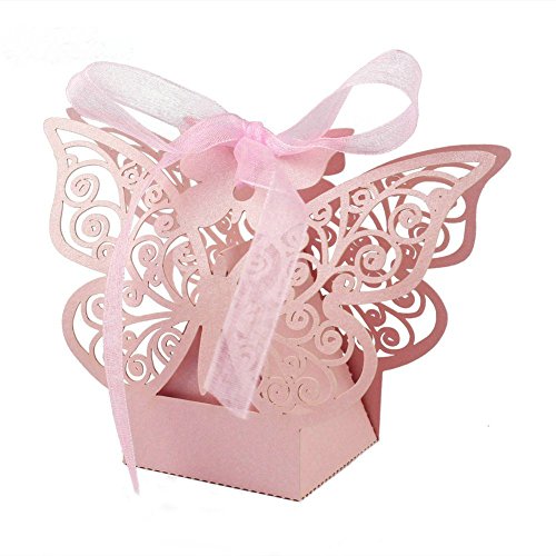 Sorive® Pack of 50 PCS Big Butterfly Laser Cut Candy Gift Boxes with Ribbon Wedding Party Favor (Pink)
