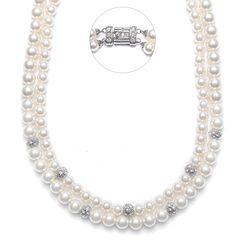 Make an unforgettable grand entrance wearing this elegant vintage style special occasion necklace boasting two rows of lustrous imitation pearls and AAAAA grade Cubic Zirconia - with the fabulous look of priceless pearls and diamonds. From Mariell's luxury collection, our exclusive designer bridal necklace will add tailored sophistication to your wedding, formal or business wardrobe. Our popular 2-strand signature pearl collar features a row of 5mm glass-based pearls nestled against a second row of 6mm pearls, both accented with Genuine Platinum-plated silver micro-pave fireballs. With meticulous attention to detail, we have finished this exquisite 16" necklace with a pave Art Deco style bejeweled box clasp giving it the look and feel of priceless fine jewelry...at a fraction of the cost. With its timeless silhouette and classic styling ideal for any occasion, you'll enjoy this pearl necklace for years to come. Its unsurpassed quality makes this an impressive statement necklace for gift-giving. Complete your special day ensemble with our matching Mariell Designs style 3246B, sold separately. We promise you'll adore this Editor's choice "Breakfast At Tiffany's" style pearl necklace or your Money-Back. Treat yourself or someone you love to this seriously irresistible antique-reproduction heirloom-style necklace. As always, Enjoy Mariell's exclusive 100% Money-Back Risk-Free Purchase policy and Lifetime Guarantee.Feature