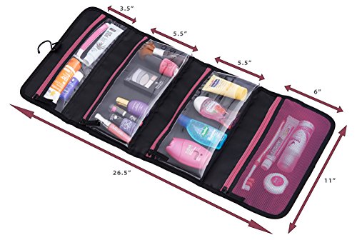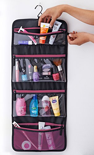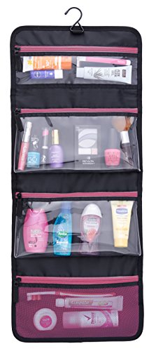 -. Feature : TIME SAVER: See through pockets so you can see all items at a quick glance / STOPS LEAKS: The top 3 pockets are made from pvc so you can safely store liquid based items / EASY OPEN ZIPPERS: Zippers have puller tags to help open and close each pocket / LONG LASTING: Nylon material, metallic hook, size #5 zippers, pvc pockets / SIMPLIFY YOUR TRAVEL: Folds up to a small size to make it easier to travel with