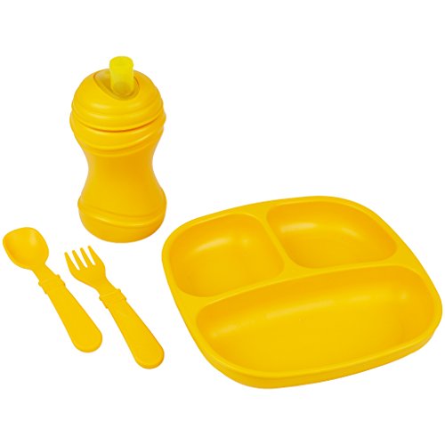 -. Feature : Made in the USA / Made from FDA approved recycled milk jugs / BPA, Phthalate, PVC and Melamine FREE / Top rack dishwasher safe / Includes: 1 Divided Plate, 1 No Spill Sippy Cup, 1 Utensil Set (Spoon and Fork)