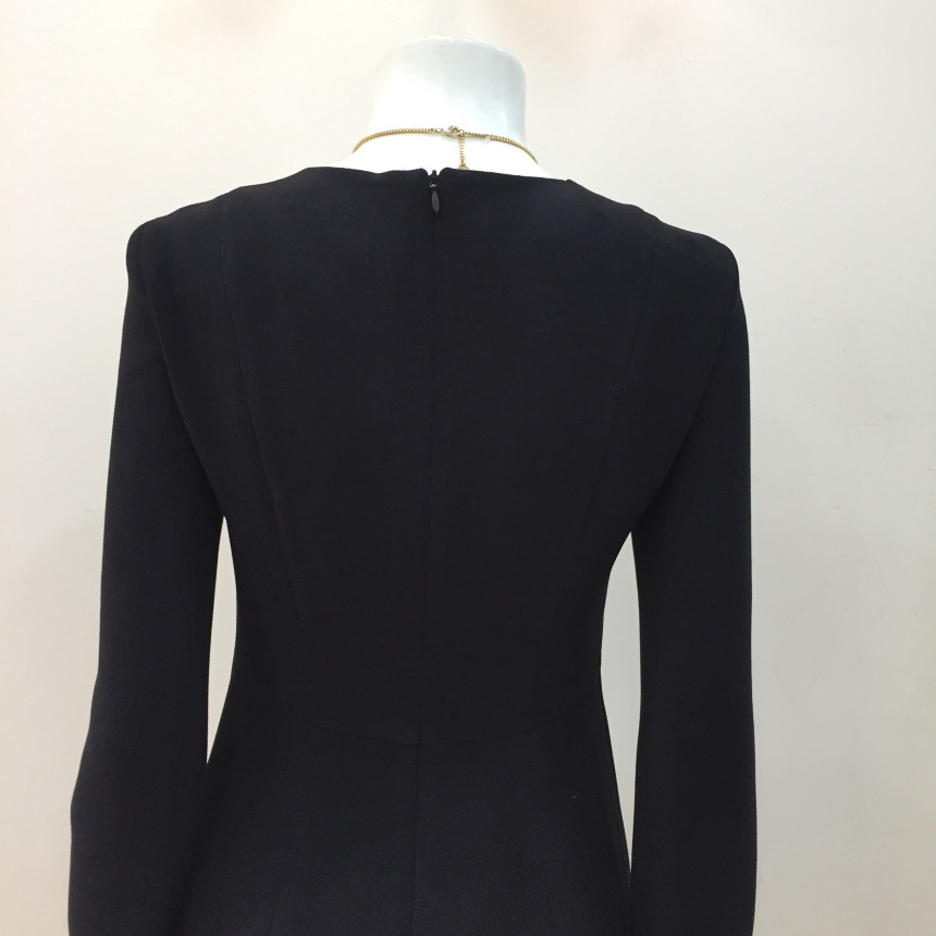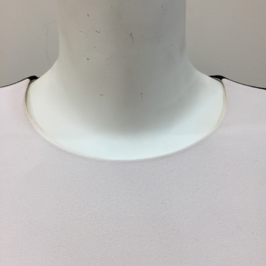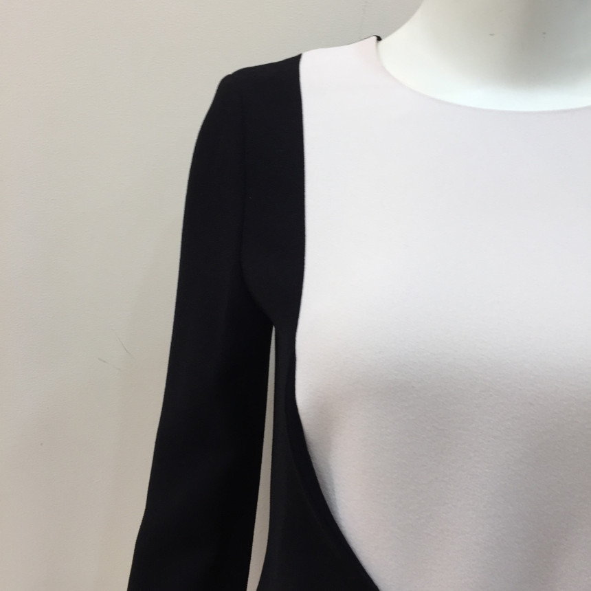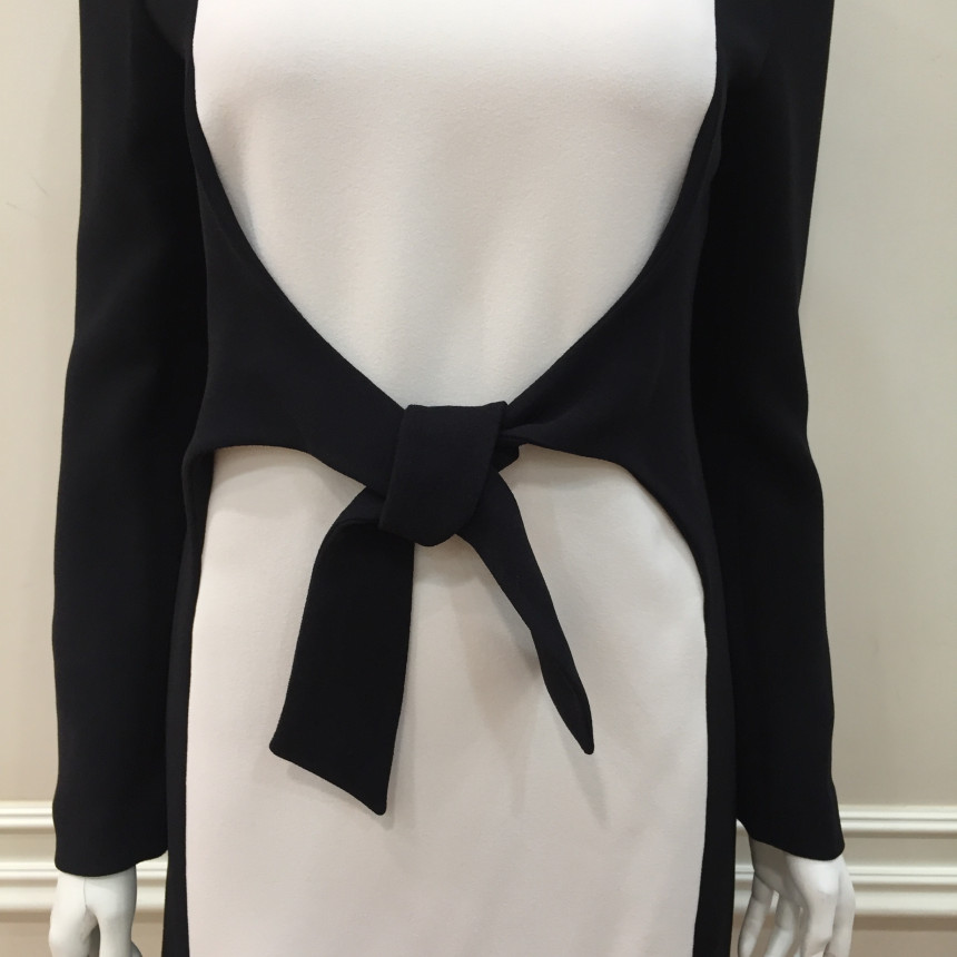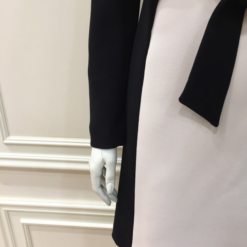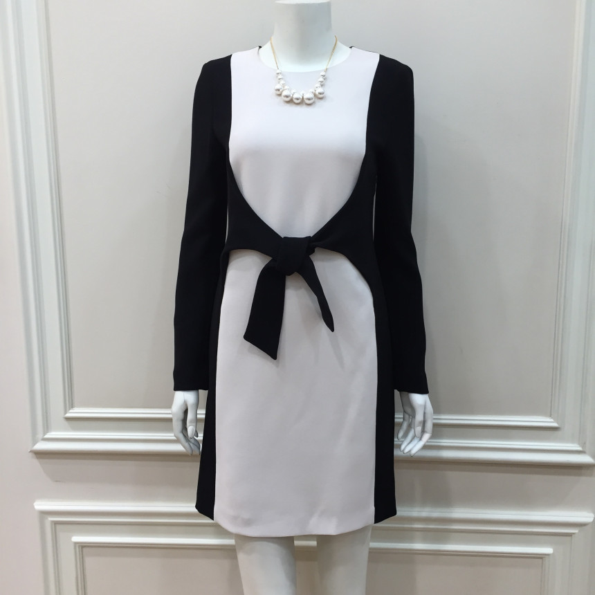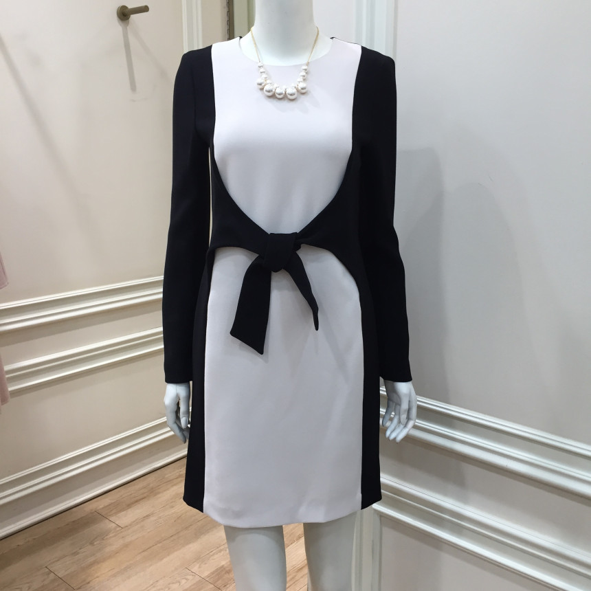 화이트,블랙 배색을 준 원피스로 앞으로 리본으로 묶을수 있는 디테일이 포인트 입니다.
