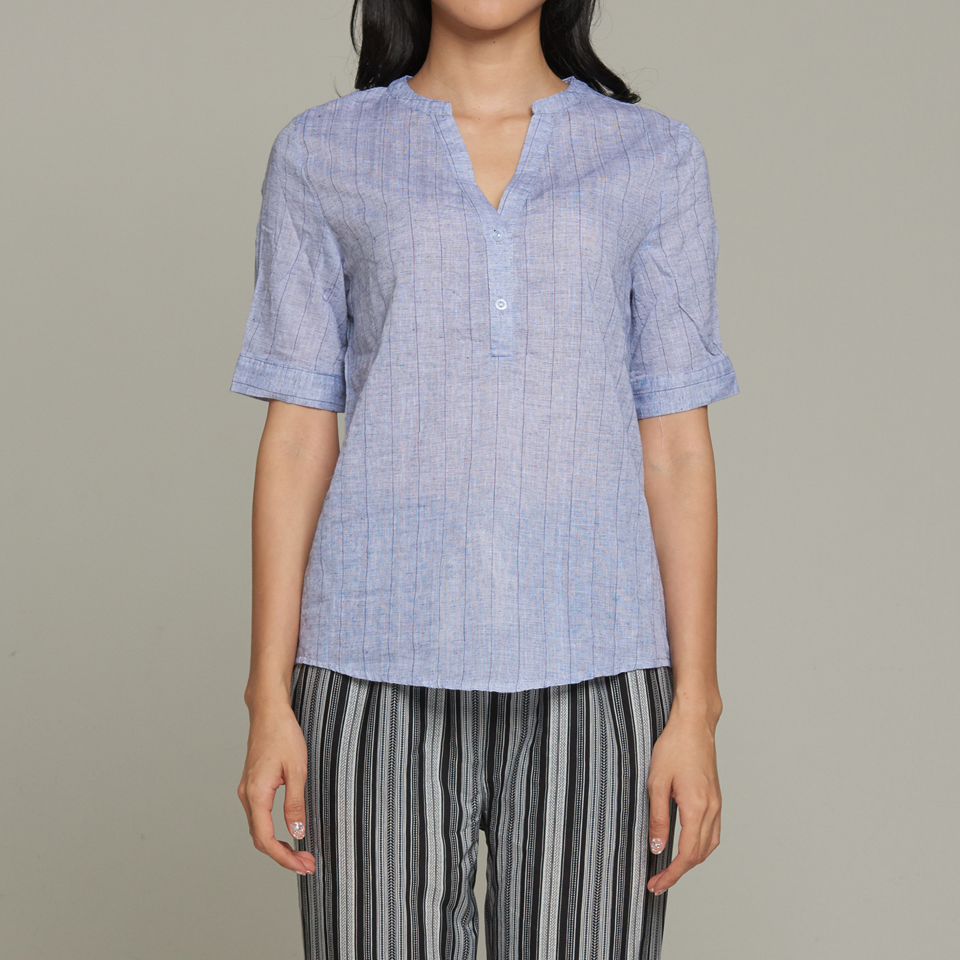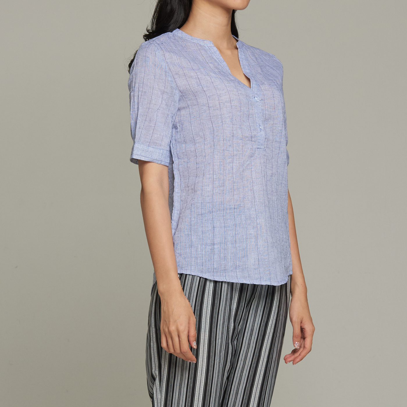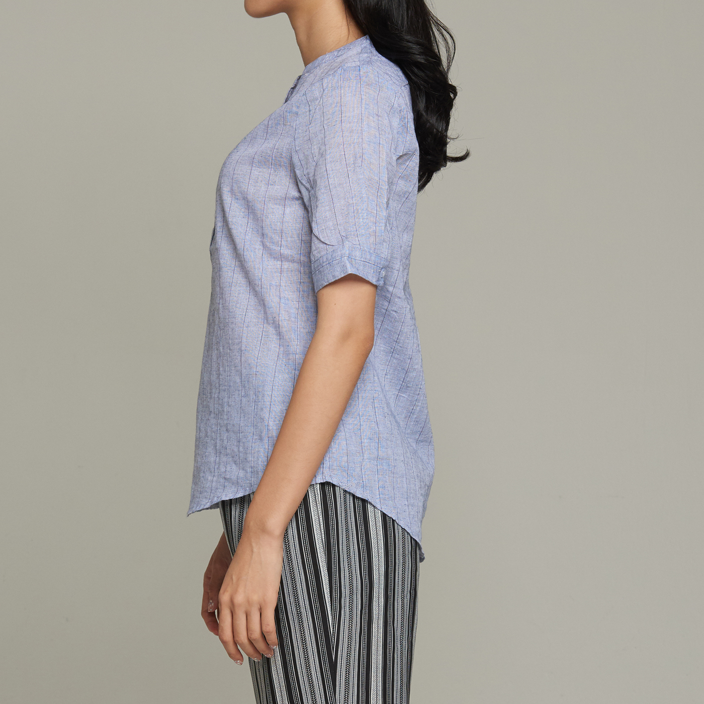 어깨선이 딱 떨어지는 은은한 컬러의 스트라이프 차이나 넥 셔츠입니다.