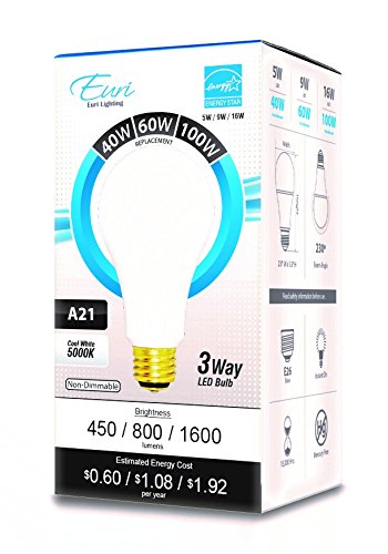 Euri Lighting EA21-1050et LED A21 3-Way Bulb, Everyday Line, Cool White 5000K, Non-Dim, 5W 9W 16W (40W 60W 100W Equivalent), 230 Degree Beam Angle, Med. Base (E26), UL & Energy Star Listed