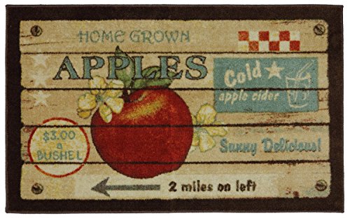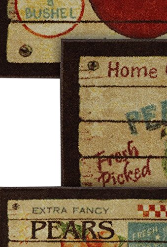 Vintage fruit crates come to life on these easy care kitchen rugs. A non-skid backing and plush, soft face will make spending time in the kitchen even more enjoyable. Printed on the same machines that manufacture one of the world’s leading brands of printed carpet, this rug is extremely durable and vibrant. This technology allows the use of multiple colors to create a rug that is wonderfully designed and applicable to any room in your home. Printed on the same machines that manufacture one of the world’s leading brands of printed carpet, this rug is extremely durable and vibrant. This technology allows the use of multiple colors to create a rug that is wonderfully designed and applicable to any room in your home. With this gorgeous contemporary style and fruit themed print, this rug's pile height is 13/32 in high. Remember to keep the pile and fabrics in tip top shape. Area rugs should be spot cleaned with a solution of mild detergent and water or cleaned professionally. Regular vacuuming helps rugs remain attractive and serviceable. Only the best quality materials will do. This rug is printed with a cut pile on Wear Dated 100% nylon, backed with latex. Made in USA.Feature