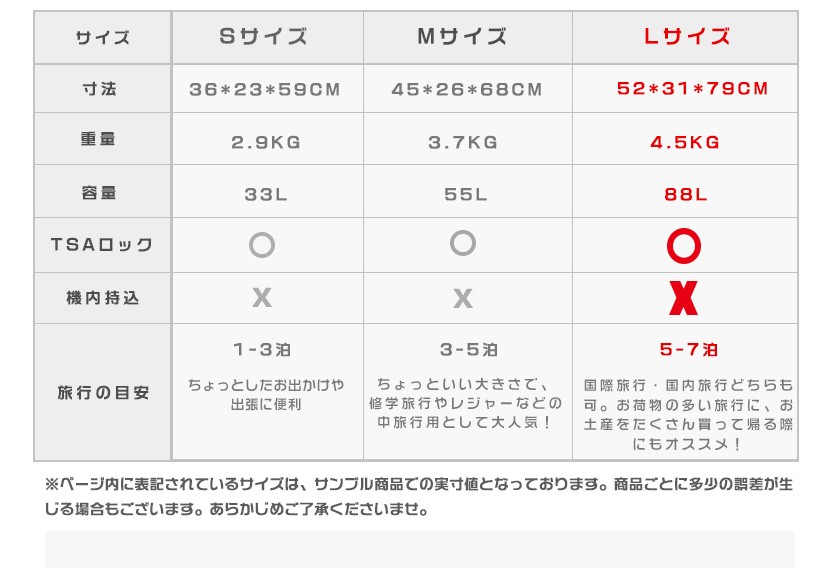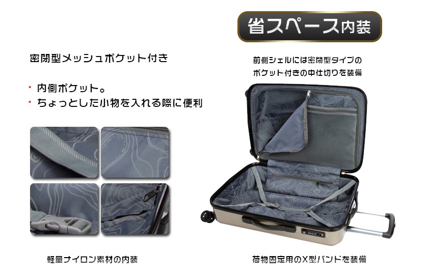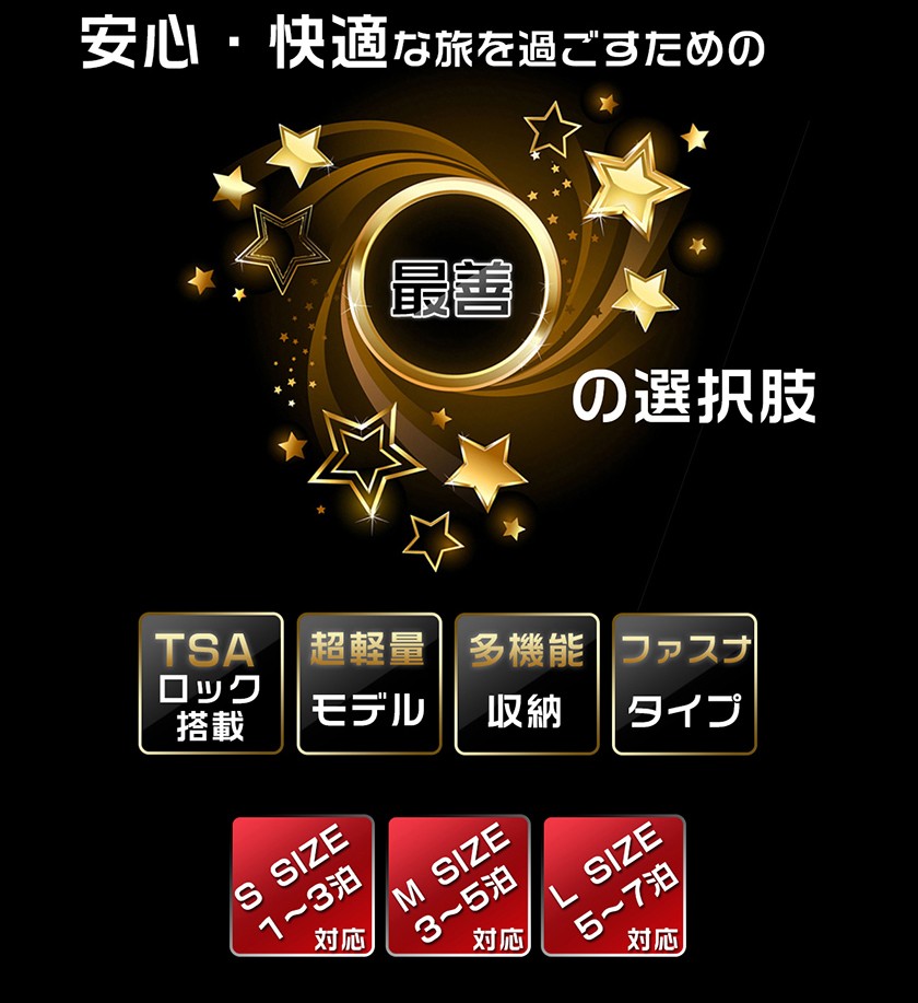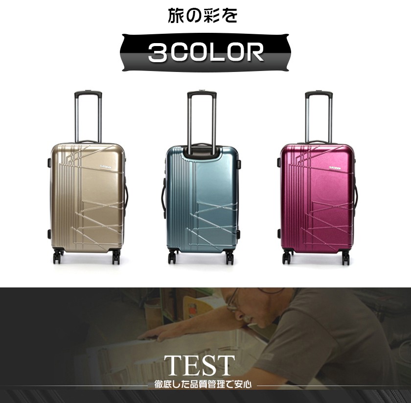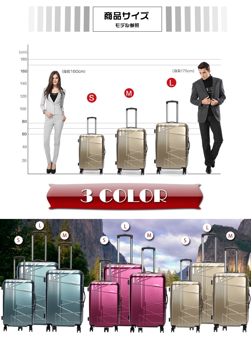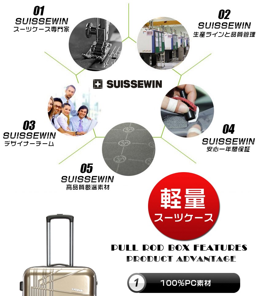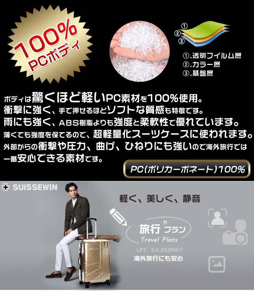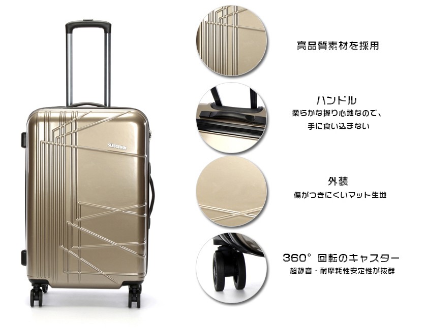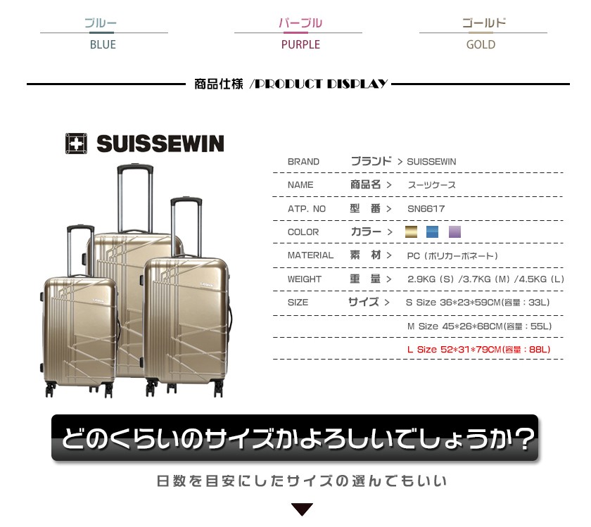 素材は軽くて耐久性に優れたABS樹脂+PC 100%(本体部分)キャスターは操作性のスムーズな360度回転 4輪独立サイレントキャスター段階調整キャリーハンドルTSAロック搭載のファスナーロック式。★商品名称:スーツケース★ブランド:SUISSEWIN★型番:SN6617★素材:表装:ABS+PC 100%(本体部分)裏装:1680D ballistic nylon(バリスティック ナイロン)+Polyester(ポリエステル)★Sサイズ外寸:幅約36cm*奥行約23cm*高さ約59cm★Sサイズ重さ:約2.9KG★Sサイズ容量:33L★Mサイズ外寸:幅約45cm*奥行約26cm*高さ約68cm★Mサイズ重さ:約3.7KG★Mサイズ容量:55L★Lサイズ外寸:幅約52cm*奥行約31cm*高さ約79cm★Lサイズ重さ:約4.5KG★Lサイズ容量:88L★TSAロック:搭載カラー:ゴールド、パープル、ブルー※注意事項 S sizeのスーツケースは横側取っ手と底足が付いておりません。