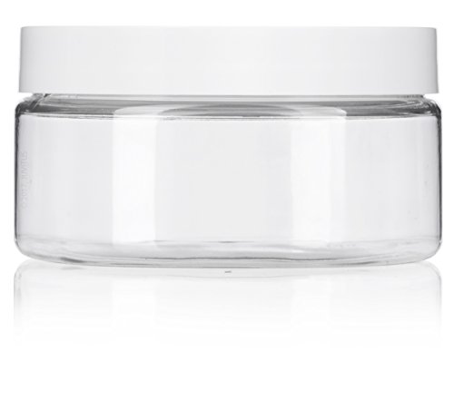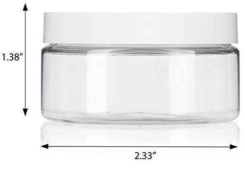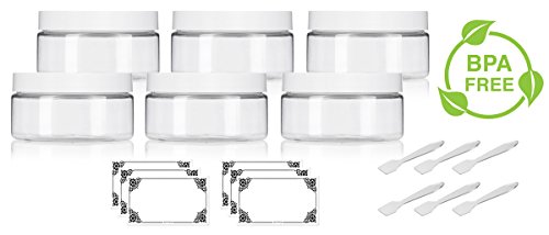 Clear PET Plastic (BPA Free) Refillable Low Profile Jar with White Lid - 8 oz (6 pack) + Spatulas and Labels