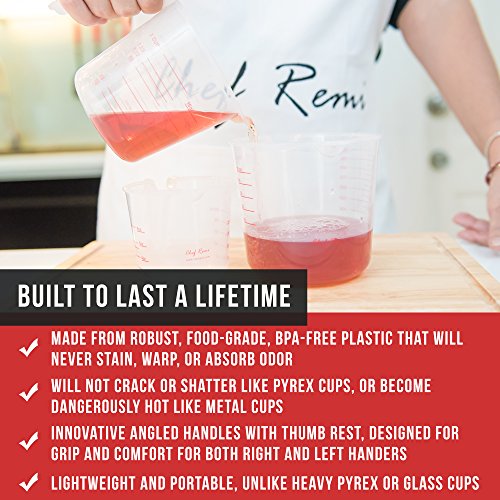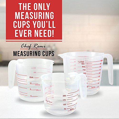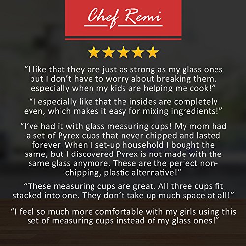 - LIFETIME GUARANTEE - The New Chef Remi 3-piece Measuring Cups Set comes with a 100% Money Back Lifetime Warranty. If you're not happy or satisfied for any reason, just contact us. Try It RISK FREE Today!