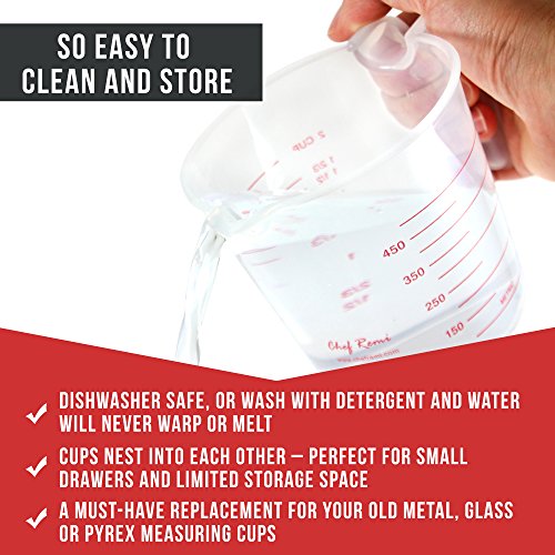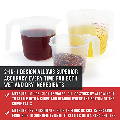 - BEST TRIPLE PACK MEASURING CUPS – Original, mix-n-measure nonstick baking supplies available for the pro chef or family kitchen. 3pack comprising of large 1000ml / 4 cup, medium 500ml / 2 cup & small 250ml / 1 cup measuring cups, with both metric milliliters / liters and standard USA cup measurements for easy conversion. Food-grade, sturdy, BPA-free, clear plastic beakers that are resistant to corrosion.