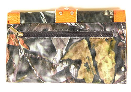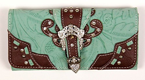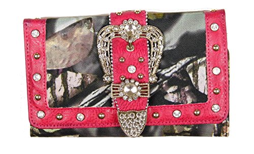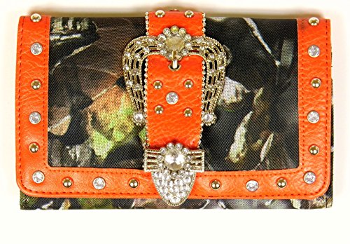 Binding : Apparel Product Description Bifold Metal Frame Wallet Belt Buckle Decoration with a Brown Trim on Front with Soft Decorated with Rhinestones Easy Push Button Open Credit Card or Business Card Slots Pic ID Windows Checkbook Cover Included Back, Magnetic Closure Pocket Note: Cow print Pattern/Picture may differ from the one pictured. 0