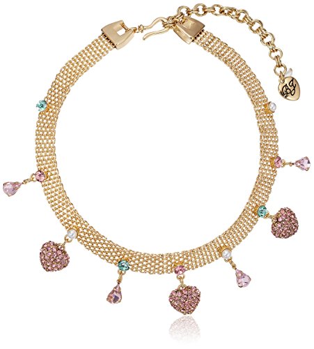 gold tone mesh choker with mixed multi charms including faceted stones, pearls and heart with pave crystal accents