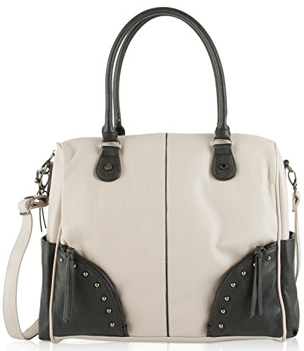 Exterior features two zip pockets with stud detail at front, two side pockets