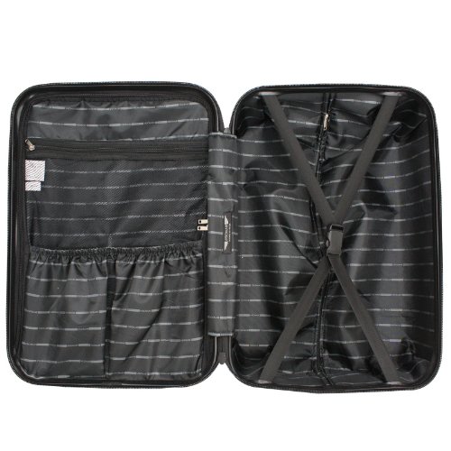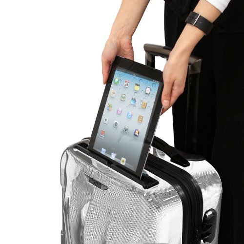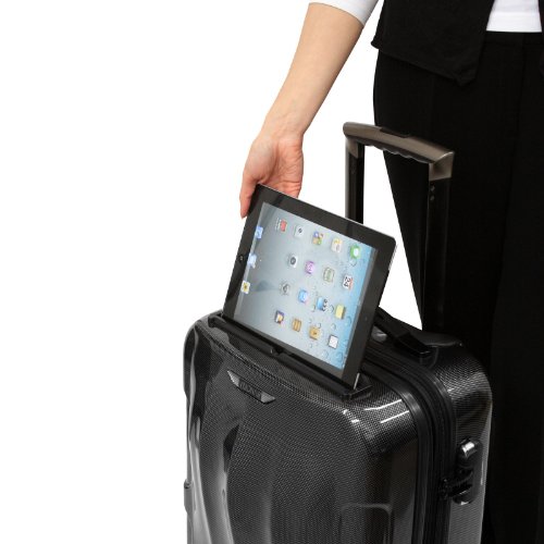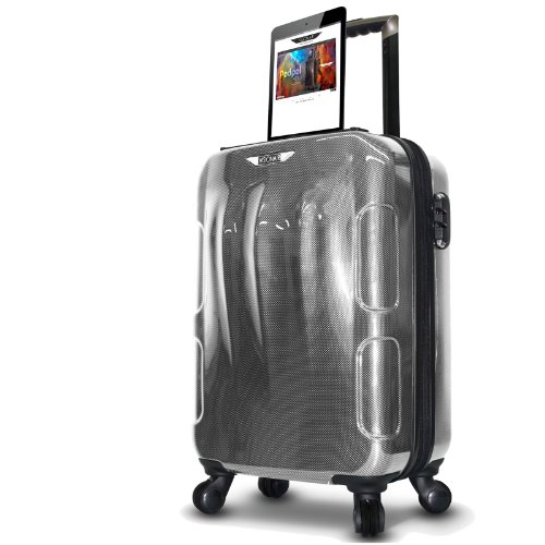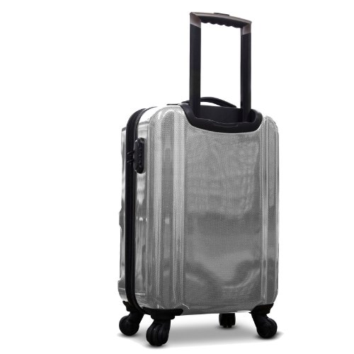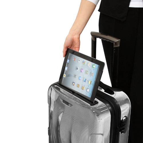 -. Feature : Material: Polycarbonate construction with Scratch Resistant Glossy Finish / Features a tablet holder, 3-digit built-in combination lock, 4-dual wheel spinner system and push-button aluminum telescopic handle / Fully lined interior with multi-function tie-down straps and interior zippered divider to keep items organized / Impact resistant polycarbonate construction / Dimensions: 22" H x 14.5" L x 10.5" W - 6.2 LB