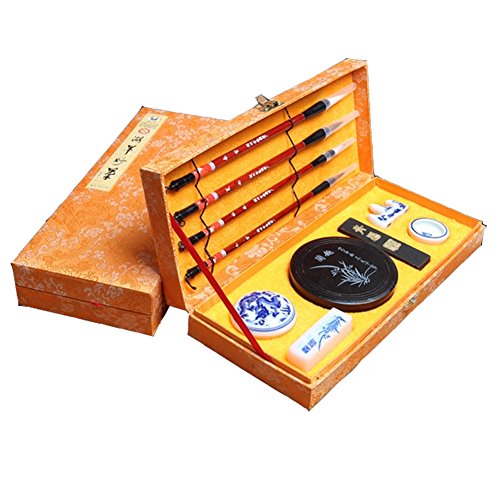 -. Feature : 4 Calligraphy Brushes. / 1 of Ink Stick, Ink Stone, Stamp Stone. / 1 Ceramic Calligraphy Brush Stand. / 1 Ceramic container with Ink Pad for Stamp and 1 Ceramic Bowl with Dragon Design for Ink. / Gift£º25 pieces of writing papers£¬one copybook£¬and two writing fabric.