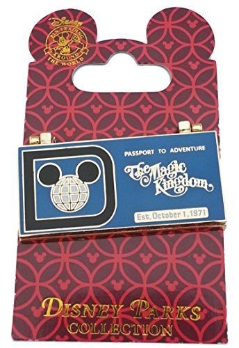 When closed the front of the pin is the top of the ticket book and reads Passport to Adventure The Magic Kingdom est October 1, 1971 and on the left has the original D and Mickey head icon
