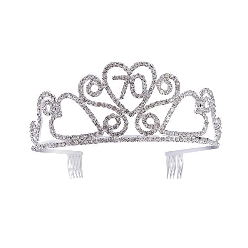 - Color: As shown. - Material: Metal and rhinestone. - Size: 15.5x16x0.2cm / 6.1x6.3x0.08inch. - Top-class alloy material with electroplating finishing. Anti- rust, nickel free and anti-allergic for safe wearing. - Perfect accessory for a women's 70 birthday celebration party. A great gift for your mother, grandmother or other relatives. - Creative party accessory with shining and exquisite crystal rhinestones which show royal glory all the time, making the host of the party look like an elegant queen. - With combs design to keep tiara in place all the day for stable wearing, not easy to fall out. - One size fits most. Free size design fits most women. Package Including 1 x 70th Birthday Tiara Crystal Rhinestone Birthday Tiara Queen Crowns Headband with Hair Combs Clip for Mother's or Grandmother's 70th Birthday Party Decorations 0