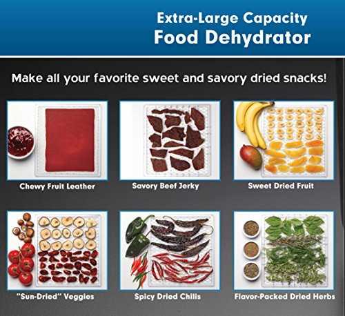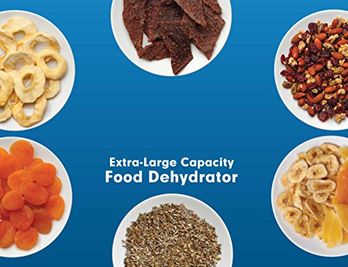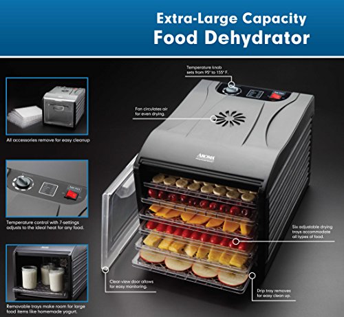 Large capacity;Automatic fan for even drying;6 removable racks that can support up to 1lb of food on each level;Adjustable thermostat from 95 Degree - 155 Degree;Includes drip tray to collect any residue from drying process
