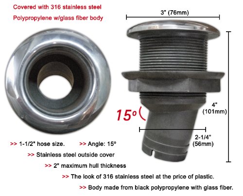 -. Feature : 1 ½´´ hose size. - 15º / The look of 316 stainless steel at the P.R.Ice of plastic. / Body made from black polypropylene with glass fiber. / Stainless steel outside cover / 2´´ maximum hull thickness