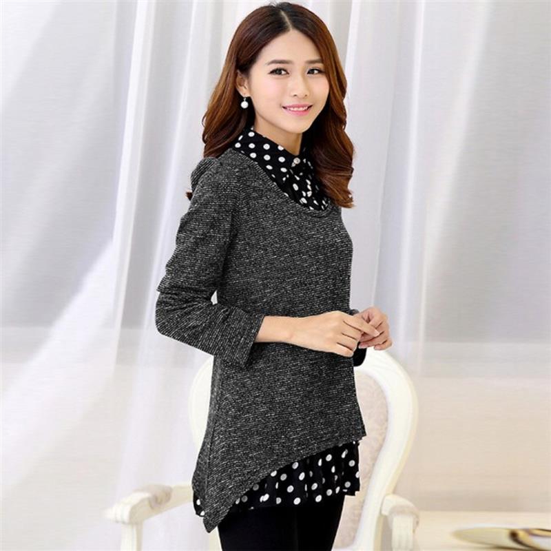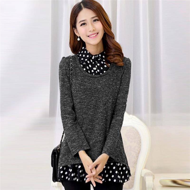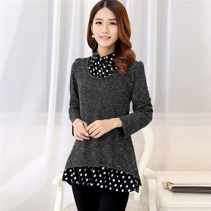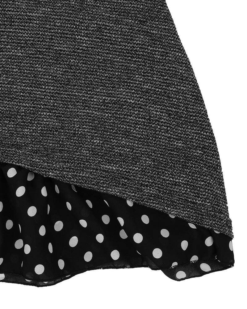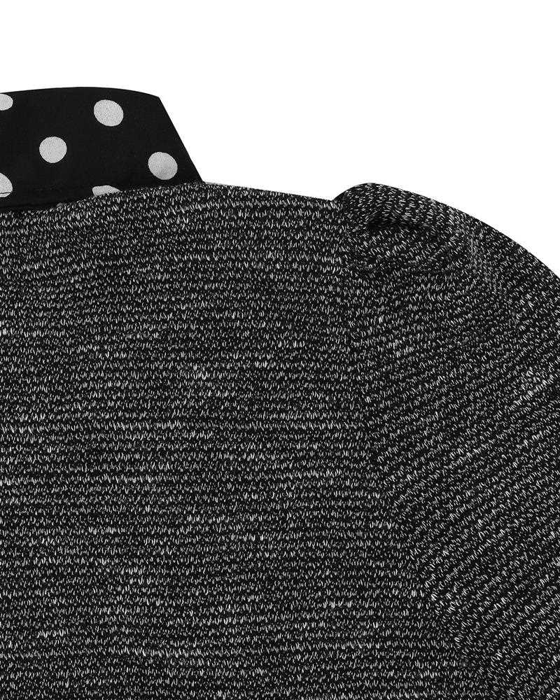 Turn-down Collar,Splicing,Fake Two-piece,Loose,Dots,Long Sleeve