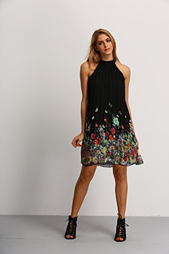 -. Feature : 100% polyester / Halter neck, sleeveless, back keyhole, with buttons / Floral P.R.Inted, short, swing dress / Model: Height:173cm/5'8", Bust:89cm/35", Waist:60cm/24", Hip:90cm/35", Wear: Size S / Please refer to Size Chart in Product Description as below